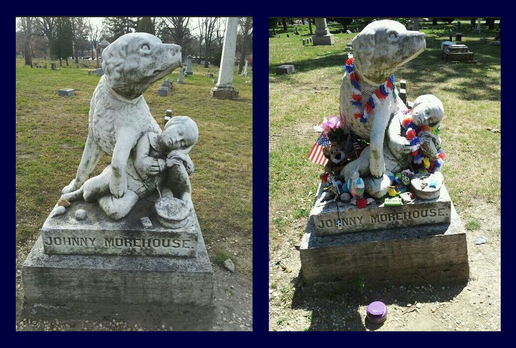 One story is that Johnny’s dog jumped in the river and drowned trying to save him. The family was so moved by his loyalty to the boy that they had the grave marker sculpted of him and Johnny.