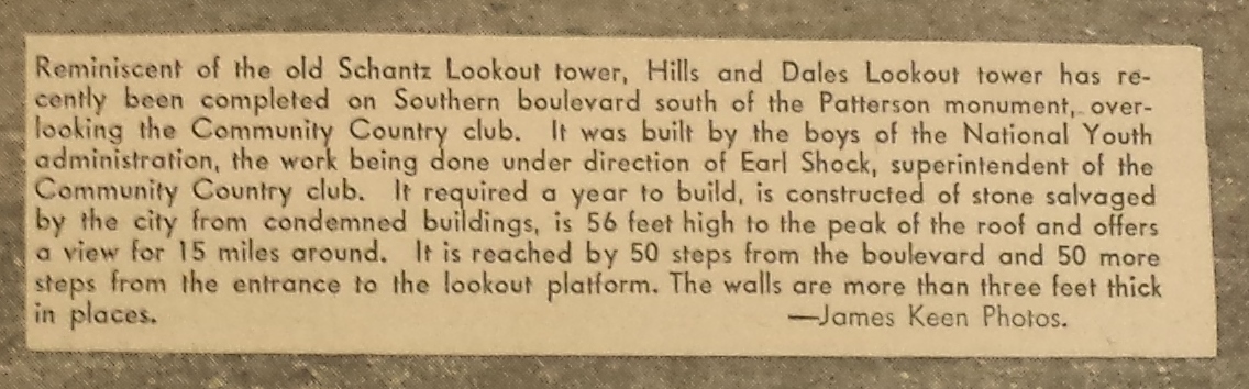 The building of the tower is straight-forward. Construction on the Hills and Dales Lookout Tower started in 1940 by the boys of the National Youth Administration. The tower was made from the salvaged stone of condemned buildings in the Dayton area. The year-long project resulted in a tower which was 56 feet high (before the roof came off) and has walls 3 feet thick.