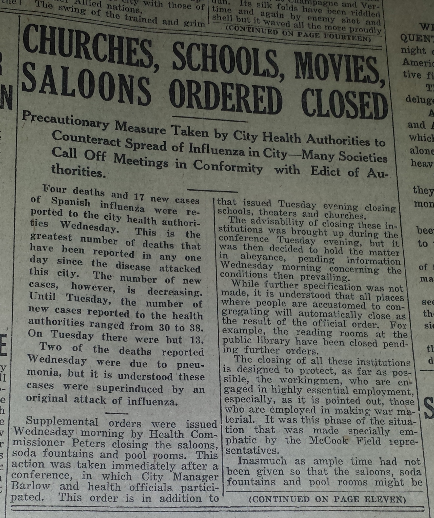 - October 8th, 1918 – Dr. A. O. Peters, Dayton’s Health Commissioner, ordered the closing of all schools, theater, and the church.
