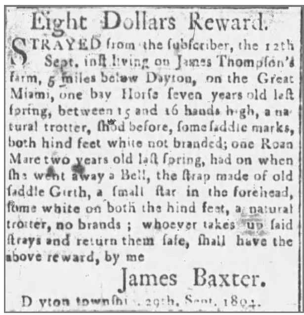Sometimes in our research, we find some interesting tidbits that aren’t enough for a full story, but we would like to share. Here are three articles from the early 1800s that give a glimpse of life back then. Two missing horses, and a tract of land for sale.