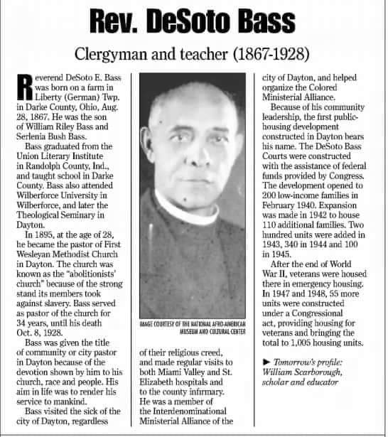 Reverend DeSoto Bass became the pastor of the Dayton First Wesleyan Methodist Church in 1895. The church was known for its abolitionist stance against slavery. Bass served at the church for thirty four years, until his death in 1928.